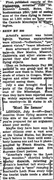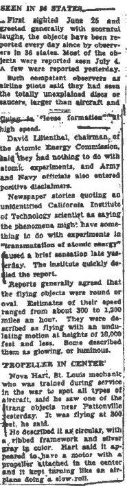 - Note - Thanks again to Frank Arnold for sending us another interesting, historical UFO news story. It is important to note the national wave of UFO sightings reported below were occurring at the exact time of the Roswell event/s. -ed